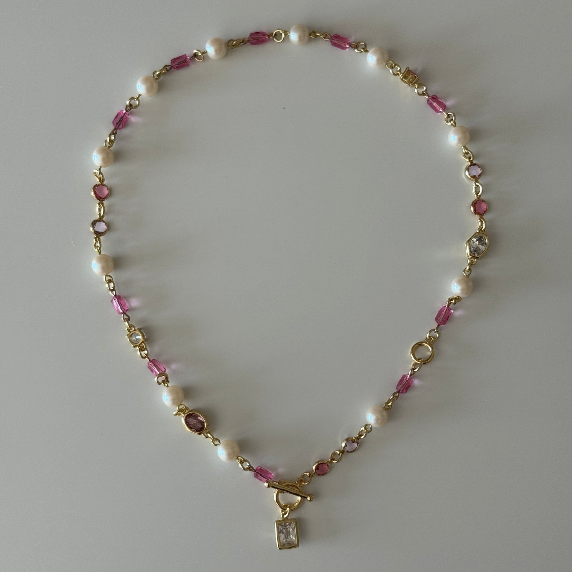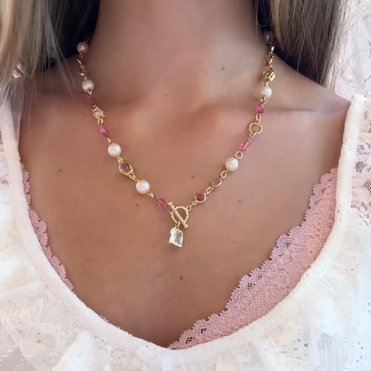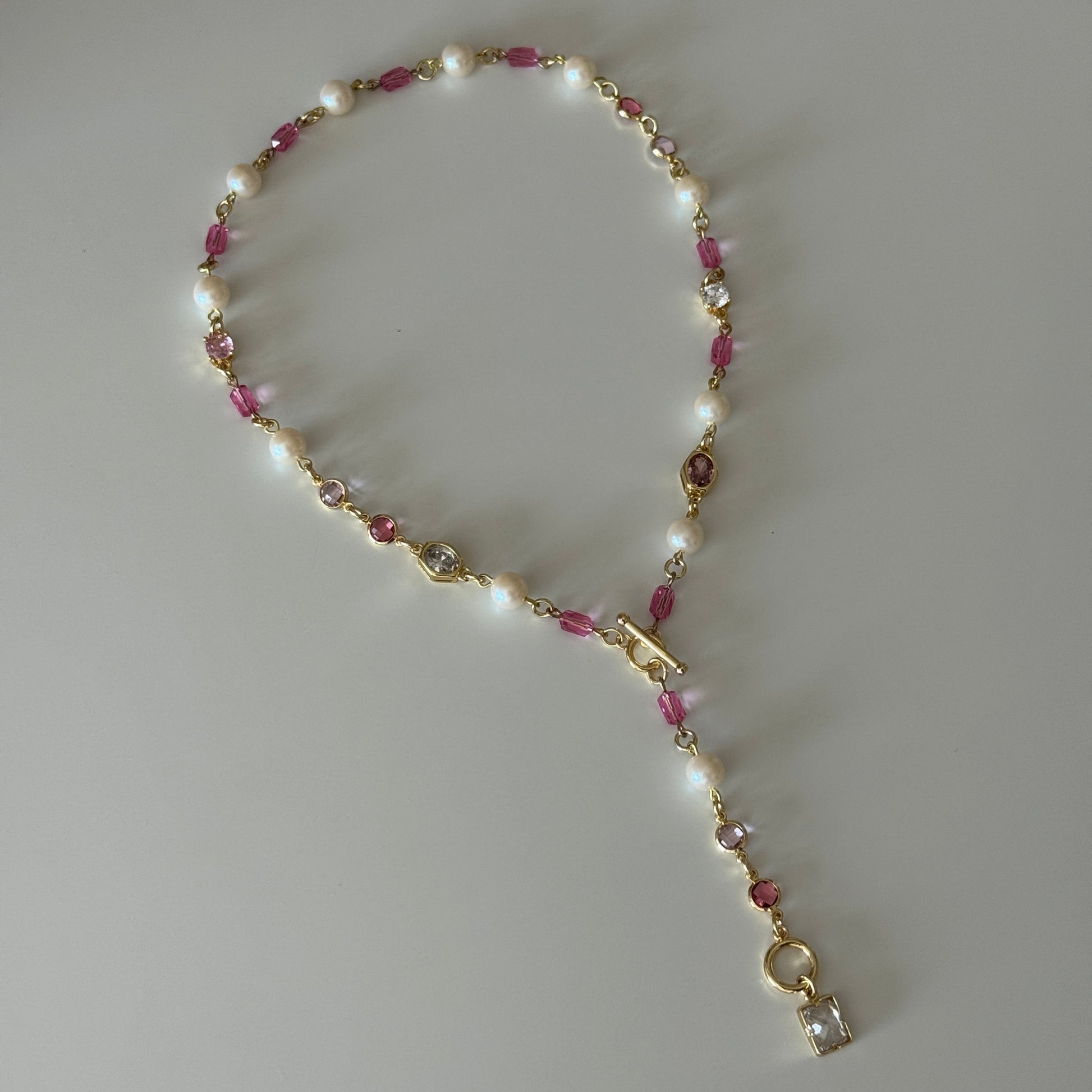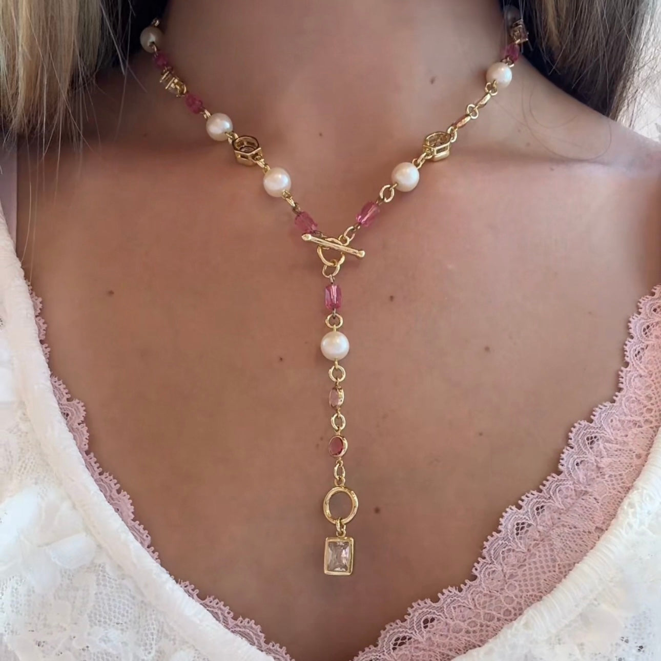 This convertible Y necklace can be worn as a choker with a long dangle as well as a longer pendant necklace with a short crystal drop.